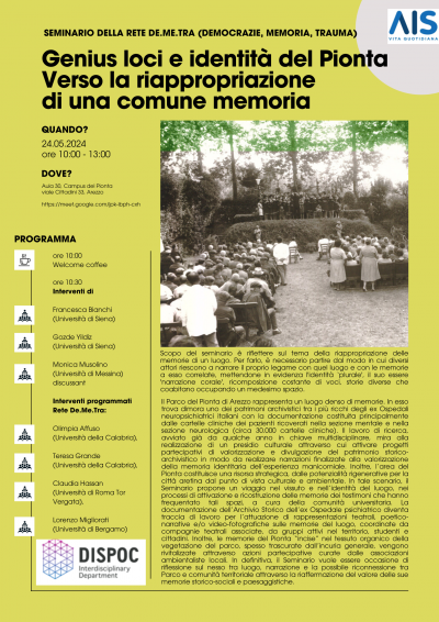 Obiettivo del Seminario, organizzato da DISPOC e Rete DE.ME.TRA e patrocinato da AIS, Sezione Vita quotidiana, è riflettere sul tema della riappropriazione delle memorie di un luogo. Il Parco del Pionta rappresenta un luogo denso di memorie conservando uno dei patrimoni archivistici tra i più ricchi degli ex Ospedali neuropsichiatrici italiani. Negli ultimi anni, la valorizzazione del patrimonio storico-archivistico insieme all'attivazione di progetti partecipativi ha sviluppato narrazioni finalizzate a rendere più fruibile la memoria identitaria dell'esperienza manicomiale. Il Seminario propone un viaggio nel vissuto e nell'identità del luogo a cura della comunità universitaria.